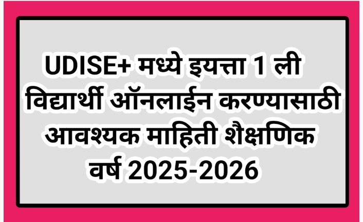 UDISE+ मध्ये इयत्ता 1 ली विद्यार्थी ऑनलाईन करण्यासाठी आवश्यक माहिती शैक्षणिक वर्ष 2025-2026 udise plus online mahiti update July 6, 2025 by Spardha Pariksha WhatsApp Group Join Now Telegram Group Join Now UDISE+ मध्ये इयत्ता 1 ली विद्यार्थी ऑनलाईन करण्यासाठी आवश्यक माहिती शैक्षणिक वर्ष 2025-2026 udise plus online mahiti update UDISE+ मध्ये इयत्ता 1 ली विद्यार्थी ऑनलाईन करण्यासाठी आवश्यक माहिती शैक्षणिक वर्ष 2025-2026 pdf download Related posts:परिभाषित अंशदान निवृत्तिवेतन योजना राष्ट्रीय निवृत्तिवेतन प्रणालीच्या अनुषंगाने भरण्यात येणाऱ्या वर्...संचमान्यता सन २०२५-२६ बाबत sanchmanyata प्रधानमंत्री पोषणशक्ती निर्माण योजनेंतर्गत नवीन निश्चित केलेल्या पाककृतीनुसार विद्यार्थ्यांना आहाराच...पूर्व उच्च प्राथमिक शिष्यवृत्ती परीक्षा इ. ५ वी ऐवजी इ. ४ थी व पूर्व माध्यमिक शिष्यवृत्ती परीक्षा इ....समूह साधन केंद्र समन्वयक (केंद्र प्रमुख) मर्यादित विभागीय स्पर्धा परीक्षा-२०२५ प्रसिद्धी निवेदनाबाबत...बालकांचा मोफत व सक्तीच्या शिक्षणाचा हक्क अधिनियम, २००९ च्या अनुषंगाने सर्व व्यवस्थापनाच्या (स्थानिक ...फेब्रुवारी-मार्च २०२६ मध्ये आयोजित करावयाच्या उच्च माध्यमिक प्रमाणपत्र (इ.१२वी) व माध्यमिक शालान्त प...राज्यातील अपात्र शिक्षक-शिक्षकेत्तर कर्मचाऱ्यांची नावे शालार्थ प्रणालीमध्ये नियमबाह्यरित्या समाविष्ट...प्रधानमंत्री पोषण शक्ती निर्माण (PM-POSHAN) योजनेतंर्गत अनुसूचित जाती या घटकांतर्गत निधी वितरणाबाबत ...सामाजिक व शैक्षणिकदृष्ट्या मागासवर्ग प्रवर्गातील (एसईबीसी) विद्यार्थ्यांसाठी असलेली शिक्षण शुल्क व प...
